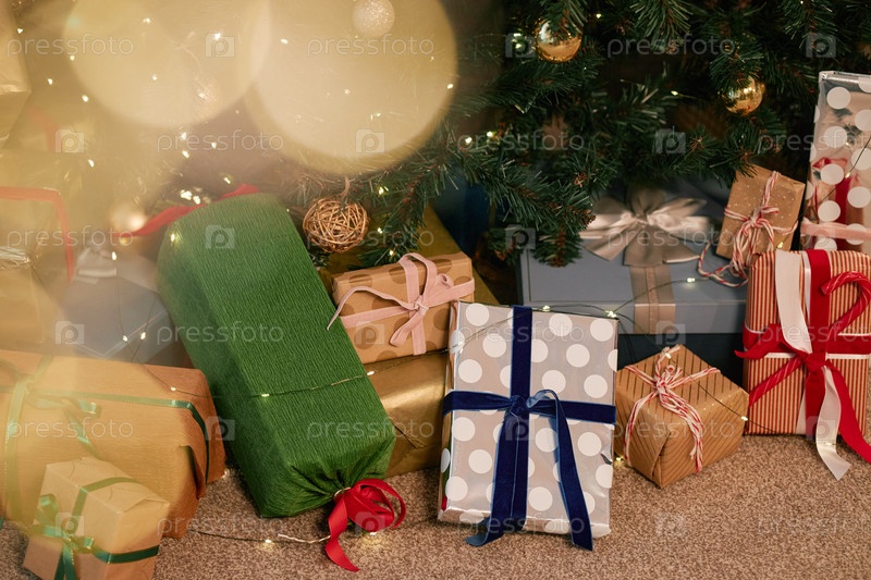 Различные упакованные подарки, расположенные под рождественской елкой в ожидании празднования
