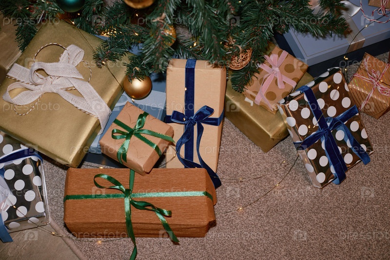 Различные упакованные коробки для подарков, расположенные под рождественской елкой во время праздничного сезона