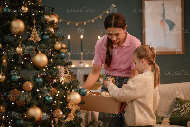 Женщина, помогающая девочке украшать рождественскую елку