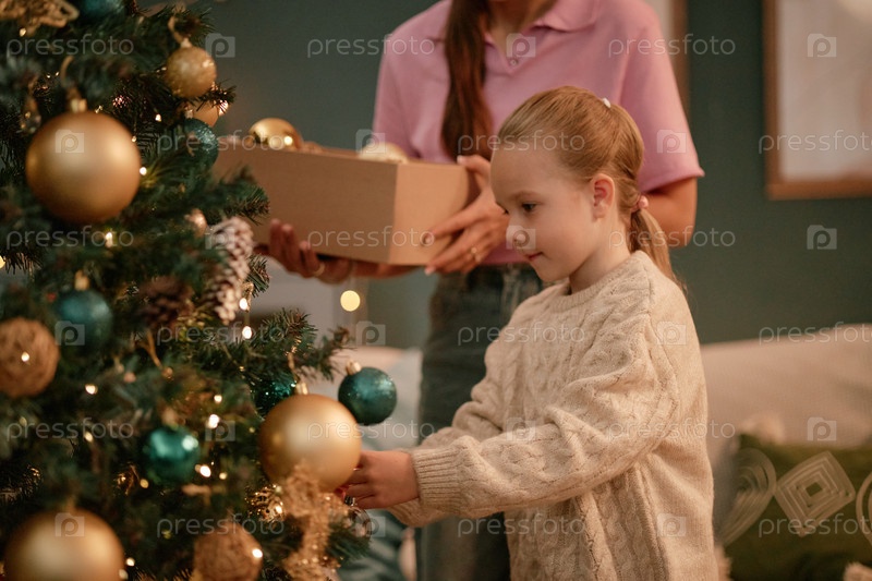 Девушка украшает рождественскую елку с помощью молодой взрослой женщины