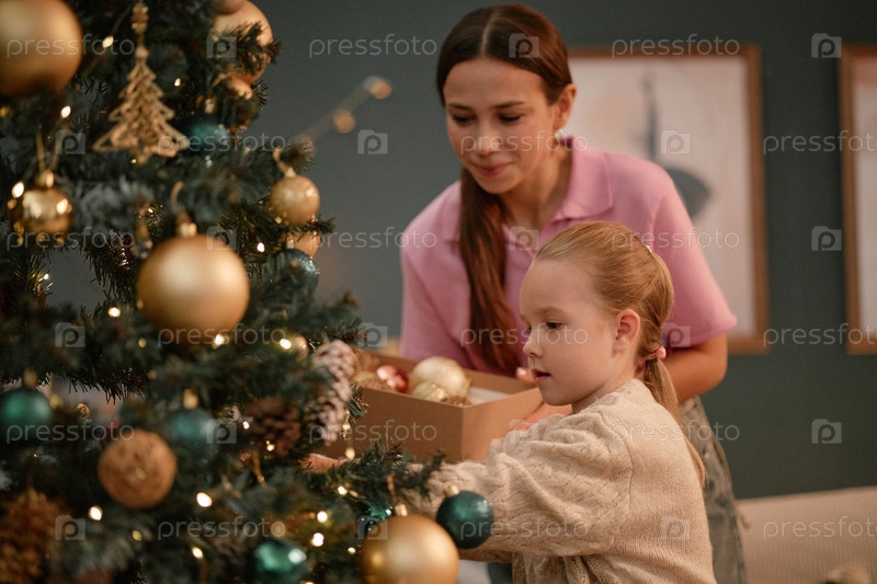 Женщина и молодая девушка украшают рождественскую елку вместе в помещении