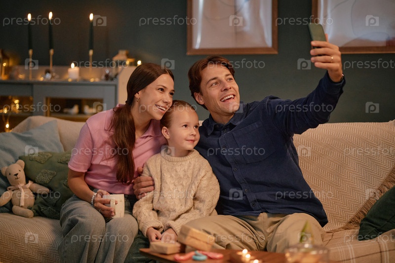 Молодая пара и ребенок улыбаются, делая селфи вместе