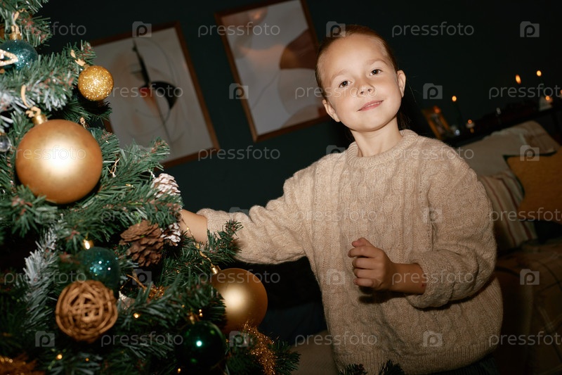 Портрет детской девочки, украшающей рождественскую елку в помещении улыбаясь