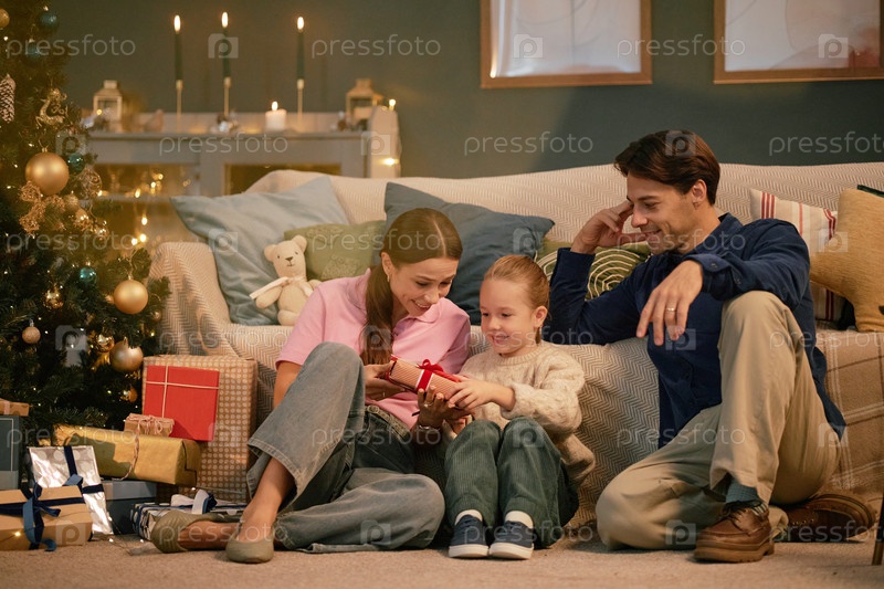 Семья сидит вместе, открывая рождественские подарки возле украшенной елки