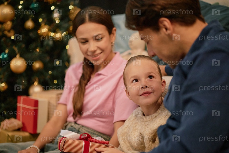 Семья празднует Рождество, давая подарки возле украшенной елки
