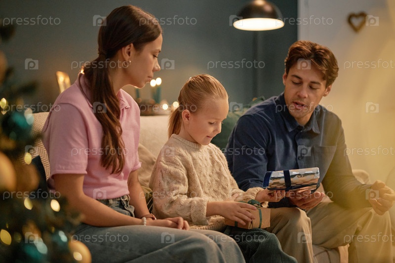 Семья сидит вместе, давая подарки молодой девушке во время праздника