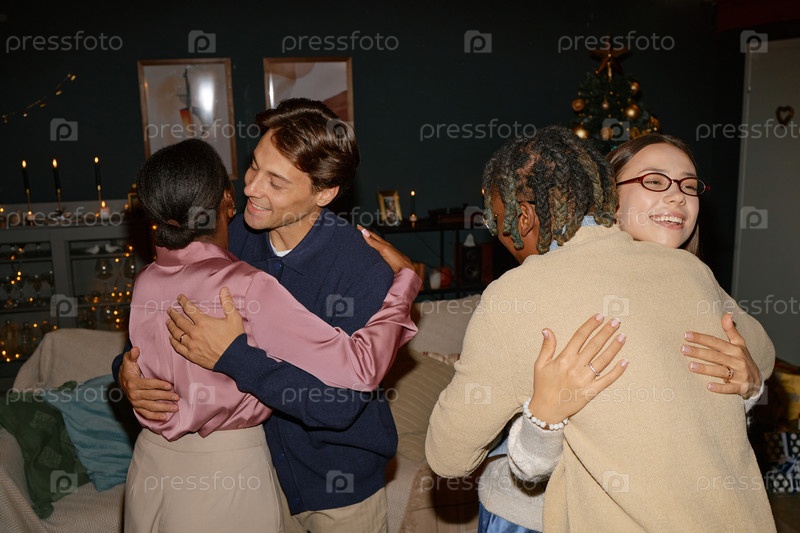 Разнообразные молодые взрослые обнимаются и улыбаются во время праздничного собрания