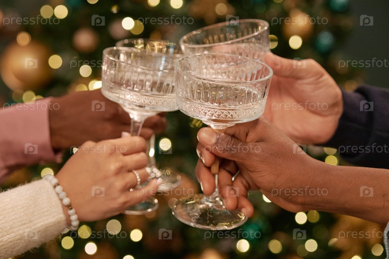 Разнообразная группа молодых взрослых, выпивающих шампанские бокалы, празднуют вместе
