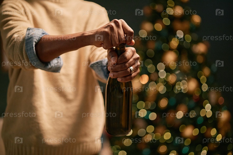 Молодой взрослый чернокожий мужчина открывает бутылку шампанского возле рождественской елки