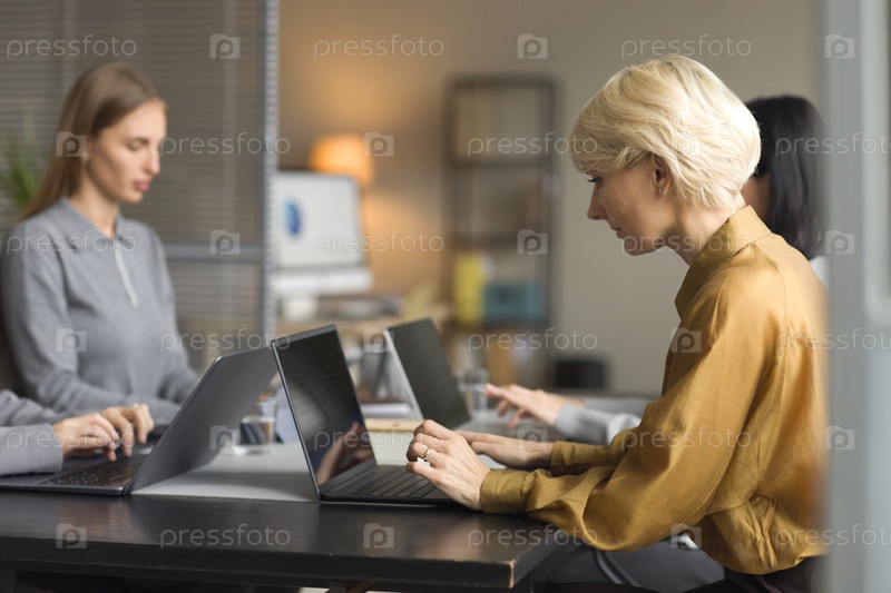 Женщина средних лет сотрудничает с коллегами в современном офисе