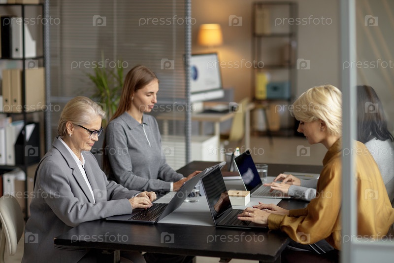Группа женщин, сотрудничающих на ноутбуках во время деловой встречи