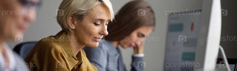 Header of Женщина средних лет, работающая на компьютере в современном офисе
