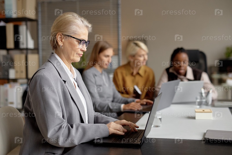 Старшая женщина, работающая на ноутбуке с различными коллегами в офисе