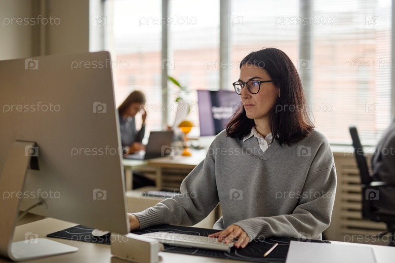 Молодая взрослая женщина работает на компьютере в современной офисной обстановке