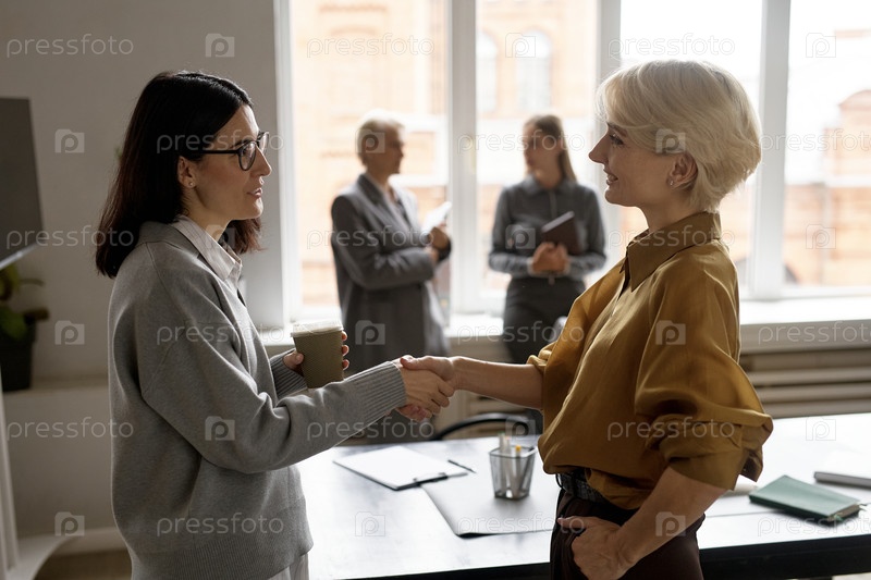 Молодая взрослая женщина, пожавшая руку женщине среднего возраста в офисе