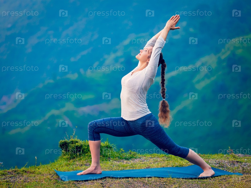 Женщина, выполняющая асану йоги Virabhadrasana 1 - Воин позирует для рекламных щитов
