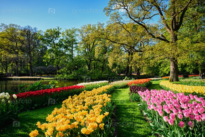Цветущие клумбы розовых тюльпанов в цветочном саду Кеукенгофа, также известном как Сад Европы, является одним из крупнейших цветочных садов мира и популярной туристической достопримечательностью