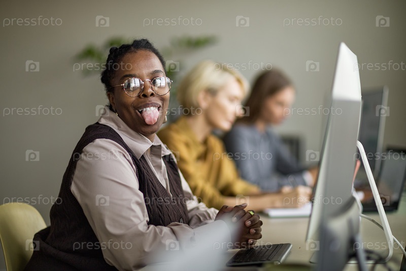 Портрет позитивной молодой взрослой чернокожей женщины, вытягивающей язык за рабочим столом