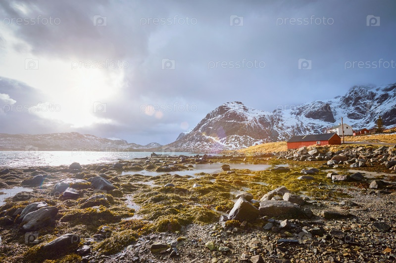 Красный дом в норвежском фьорде.Острова Лофотен, Норвегия