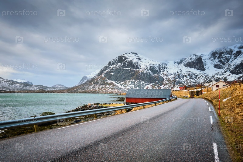 Дорога находится в норвежском фьорде.Острова Лофотен, Норвегия