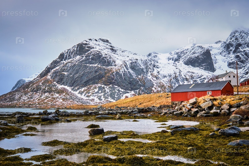 Красный дом в норвежском фьорде.Острова Лофотен, Норвегия