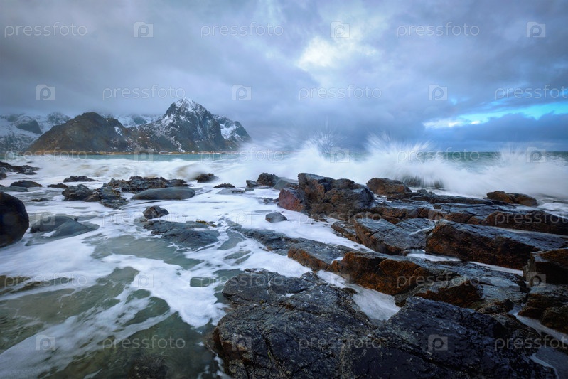 Волны разбивают камни на скалистом побережье фьорда Норвежского моря зимой