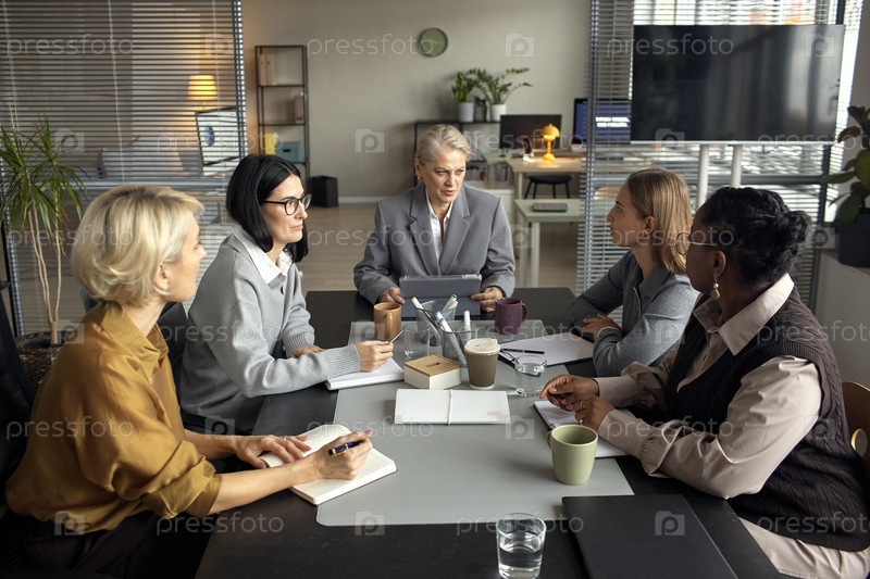 Мультиэтническая группа женщин среднего возраста, обсуждающих бизнес-стратегию в помещении
