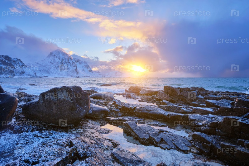 Побережье Норвежского моря на скалистом побережье в фьорде при закате солнца