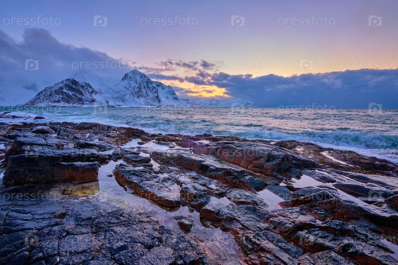 Пляж Норвежского моря на скалистом побережье в фьорде при закате солнца зимой