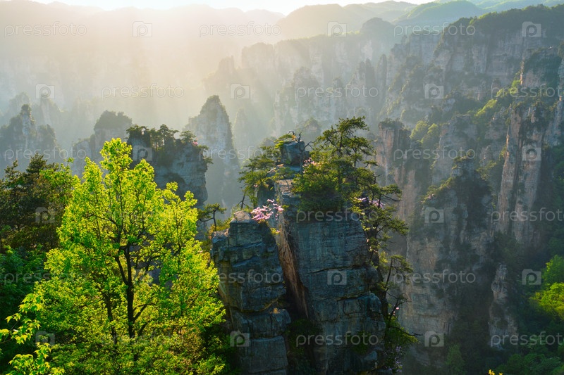 Известная туристическая достопримечательность Китая - каменные столбы скальных гор Чжанцзянджи при закате солнца в Улингюане, провинция Хунань, Китай