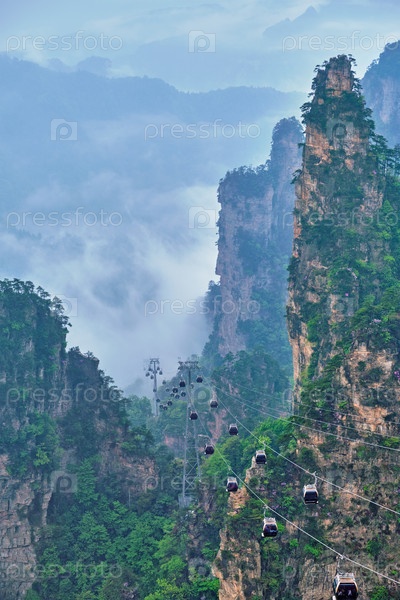 Известная туристическая достопримечательность Китая - каменные столбы скальных гор Чжанцзянджи в туманных облаках с лифтом канатного автомобиля во Вулингюане, провинция Хунань, Китай
