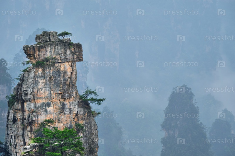 Известная туристическая достопримечательность Китая - каменные столбы скальных гор Чжанцзянджи в туманных облаках во Вулингюане, провинция Хунань, Китай. с Pan-камерой