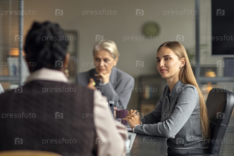Молодая женщина слушает во время деловой встречи с различными коллегами