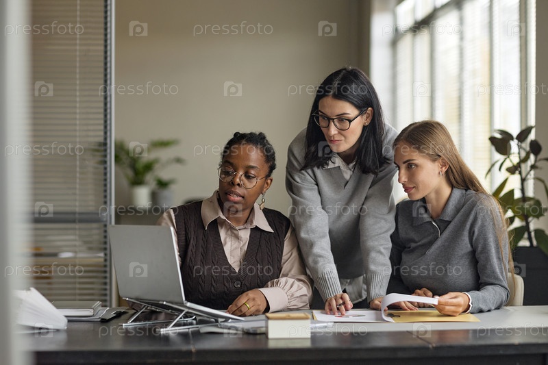 Мультиэтническая группа молодых взрослых женщин, сотрудничающих над проектом на офисном столе