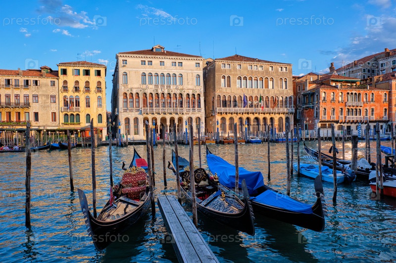 Большой канал с лодками и гондолами на закате, Венеция, Италия