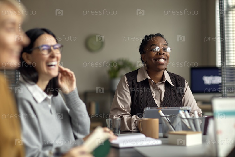 Разнообразные молодые взрослые женщины, сотрудничающие во время неформальной встречи в офисе