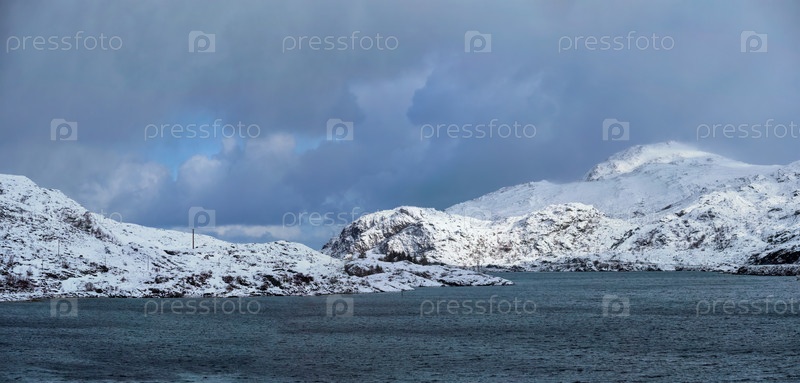 Панорама норвежского фьорда зимой, Острова Лофотен Норвегия