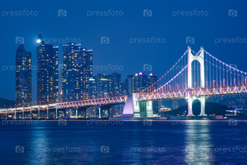 Мост Гванган и небоскребы ночью.Бусан, Южная Корея