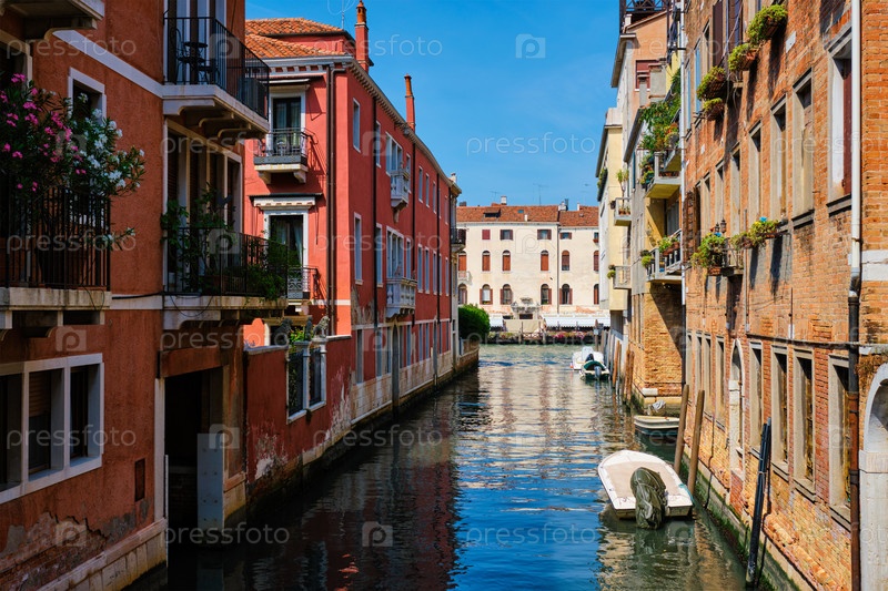 Узкий канал с гондолой в Венеции, Италия