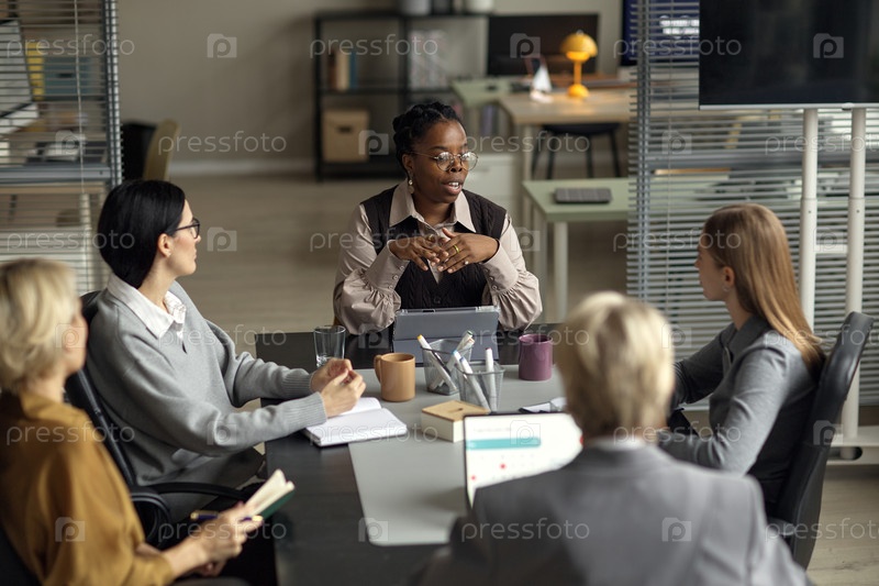 Молодая чернокожая женщина возглавляет деловую встречу с различными коллегами, сотрудничающими