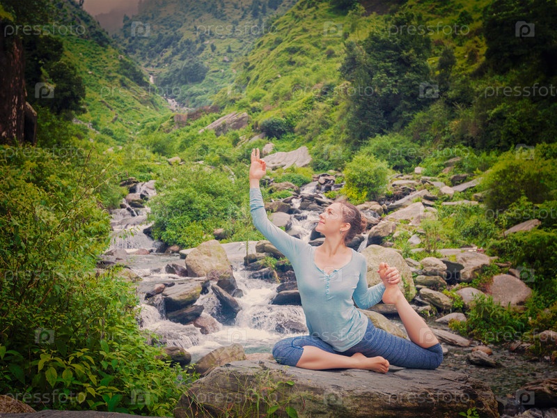 Outdoor Yoga - это молодая спортсменка, занимающаяся растягиванием асан йоги Eka pada rajakapotasana - одноногий королевский голубь, позирующий у тропического водопада