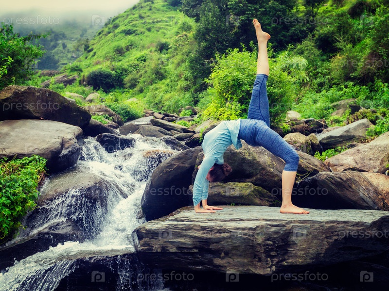 Женщина, практикующая йогу асана эка pada urdva dhanurasana Upward Bow Поза под открытым небом у водопада в Гималаях