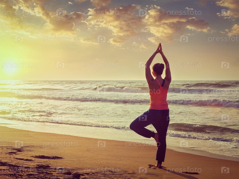 Vintage retro effect filtered hipster-style yoga image outdoors - спортсменка, практикующая хатха йогу асана Врикшасана позирует на тропическом пляже при закате