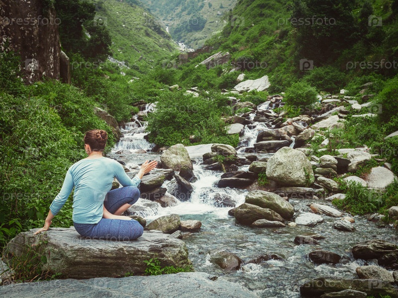 Йога упражнения на открытом воздухе - женщина, выполняющая асану Ashtanga Vinyasa Yoga asana Marihyasan D сидя спинный поворот позирует у водопада в горах