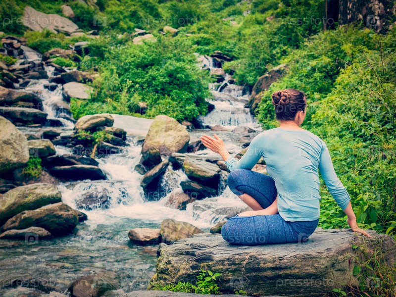 Йога упражнения на открытом воздухе - женщина, выполняющая асану Ashtanga Vinyasa Yoga asana Marihyasan D сидя спинный поворот позирует у водопада в горах