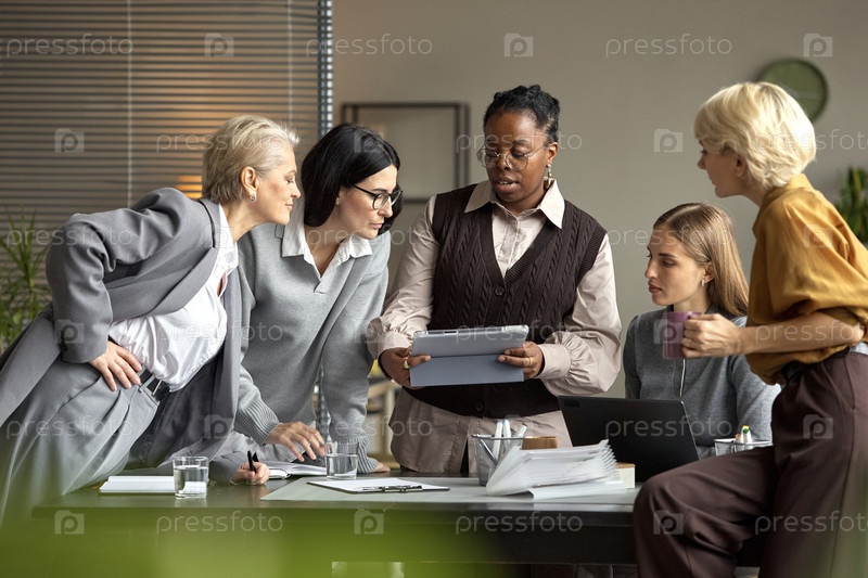 Разнообразная группа женщин среднего возраста, просматривающих документы на офисной встрече