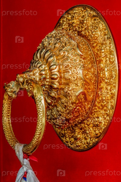 Дверная ручка в форме льва в буддийском храме. монастырь Каса, Каза, долина Спити, Химачал-Прадеш, Индия