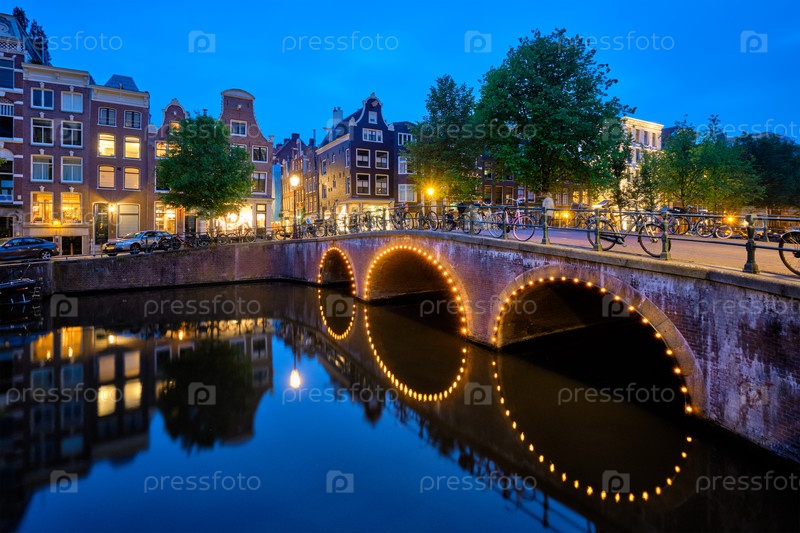 Амтердамский канал, мост и средневековые дома вечером