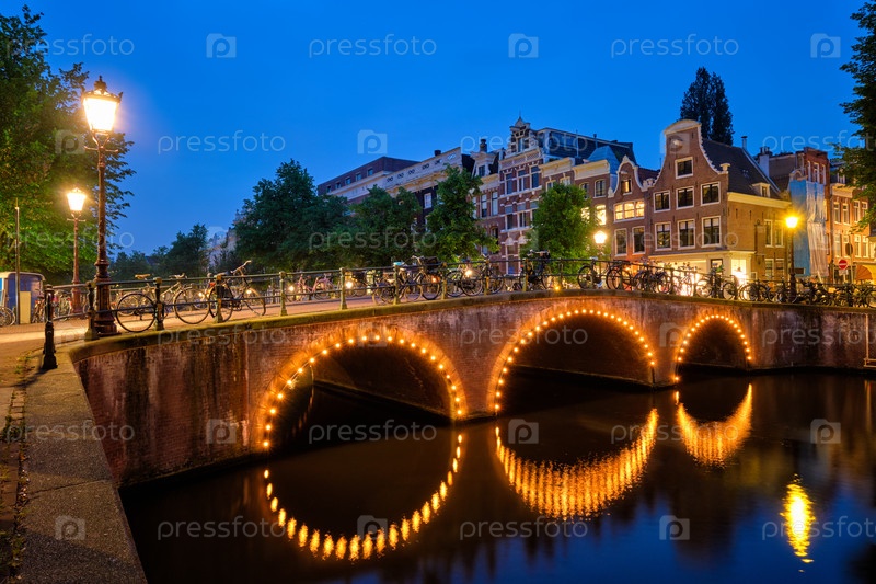 Амтердамский канал, мост и средневековые дома вечером