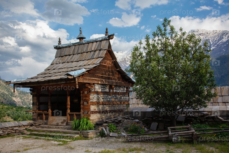 Форт Сангла, штат Химачал-Прадеш, Индия.Традиционная архитектура штата Химахал-Прадеш - слои леса чередуются с разбитыми камнями